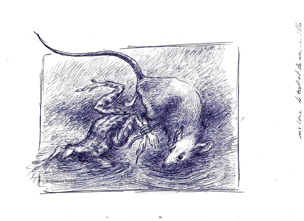 Un rat de terre, pour son malheur, se lia d’amitié avec une grenouille. Or la grenouille, qui avait de mauvais desseins, attacha la patte du rat à sa propre patte. Et tout d’abord ils allèrent sur la terre manger du blé ; ensuite ils s’approchèrent du bord de l’étang. Alors la grenouille entraîna le rat au fond, tandis qu’elle s’ébattait dans l’eau en poussant ses brekekekex. Et le malheureux rat, gonflé d’eau, fut noyé ; mais il surnageait, attaché à la patte de la grenouille. Un milan, l’ayant aperçu, l’enleva dans ses serres, et la grenouille enchaînée suivit et servit, elle aussi, de dîner au milan.